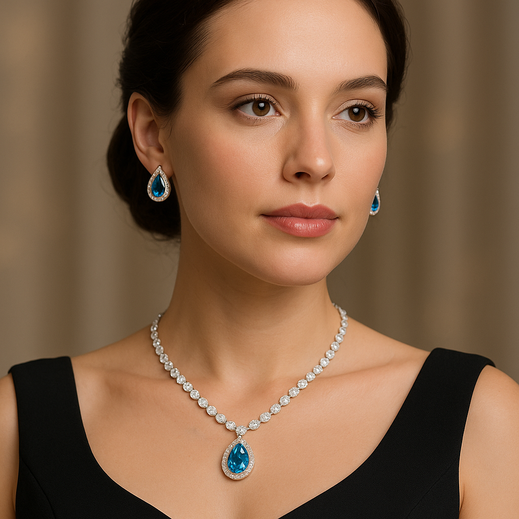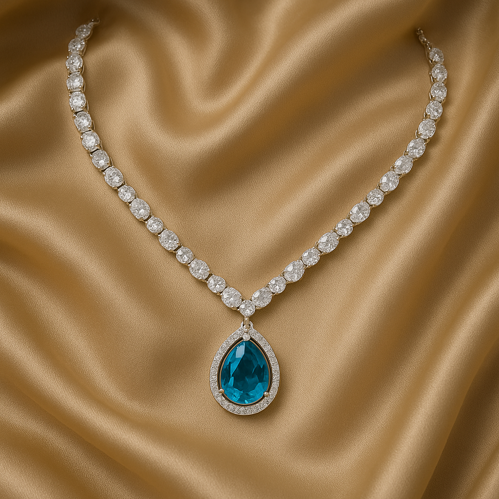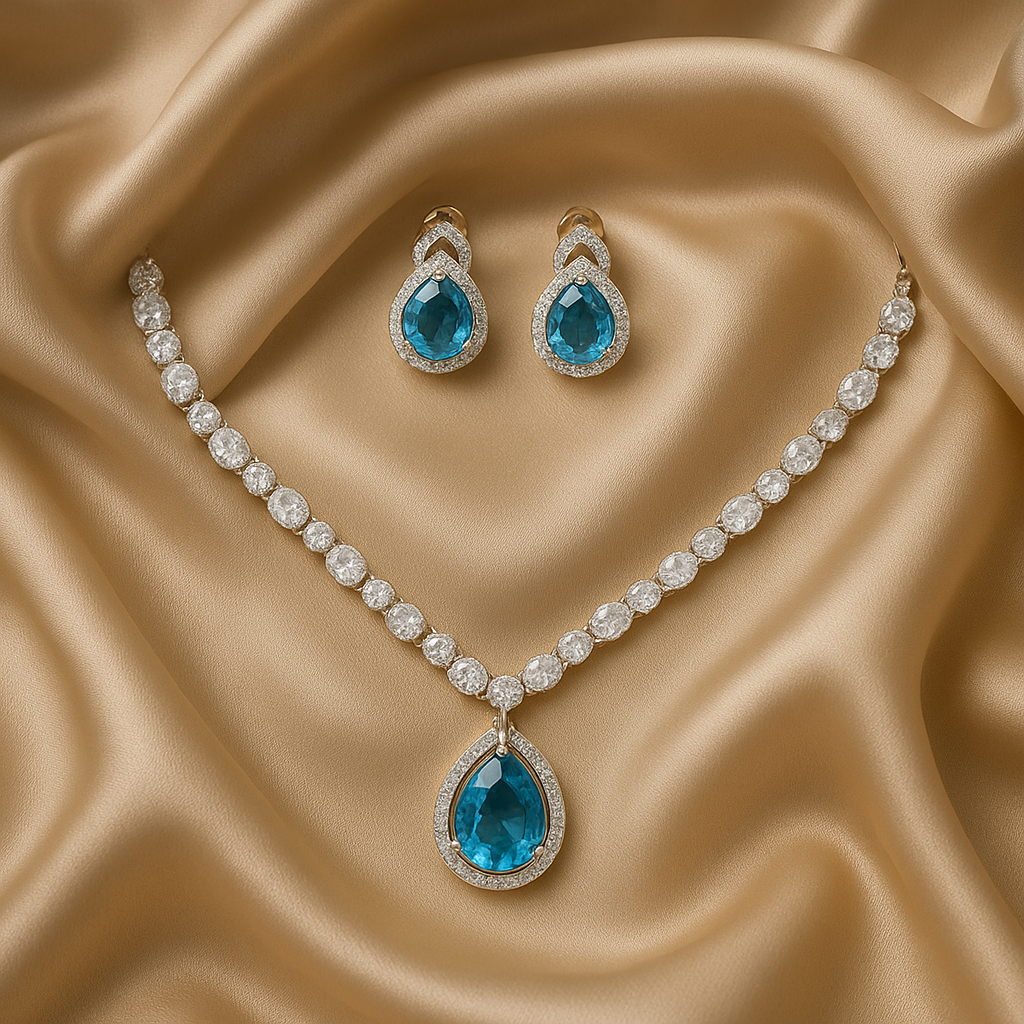 Radiate elegance and charm with this Blue Stone Diamond Look Necklace Set, a perfect fusion of modern glamour and timeless sophistication. Featuring a teardrop-shaped blue gemstone surrounded by sparkling American Diamonds, this gold-plated imitation jewellery set adds a touch of luxury to any occasion. Expertly crafted from premium alloy, it’s lightweight, durable, and ideal for parties, receptions, and festive celebrations. Complete your look with the matching earrings for a refined statement of class.