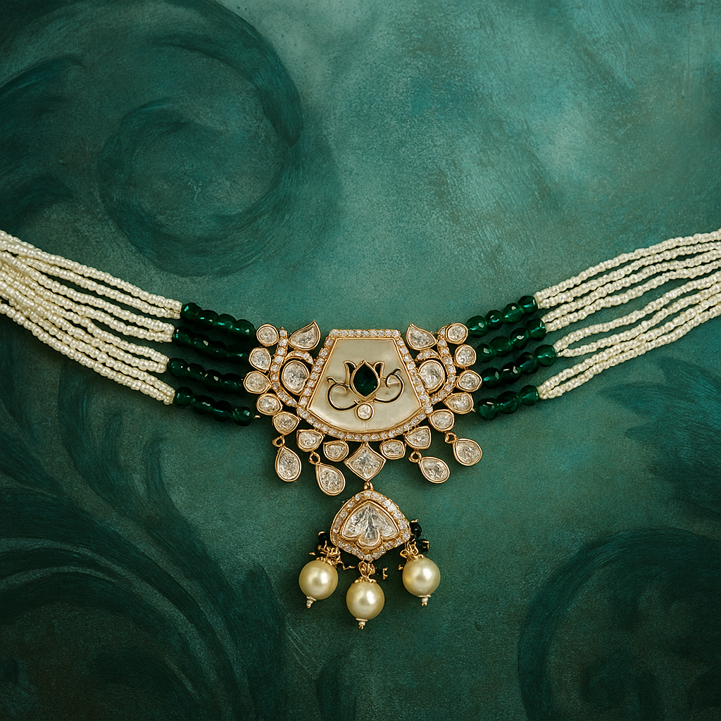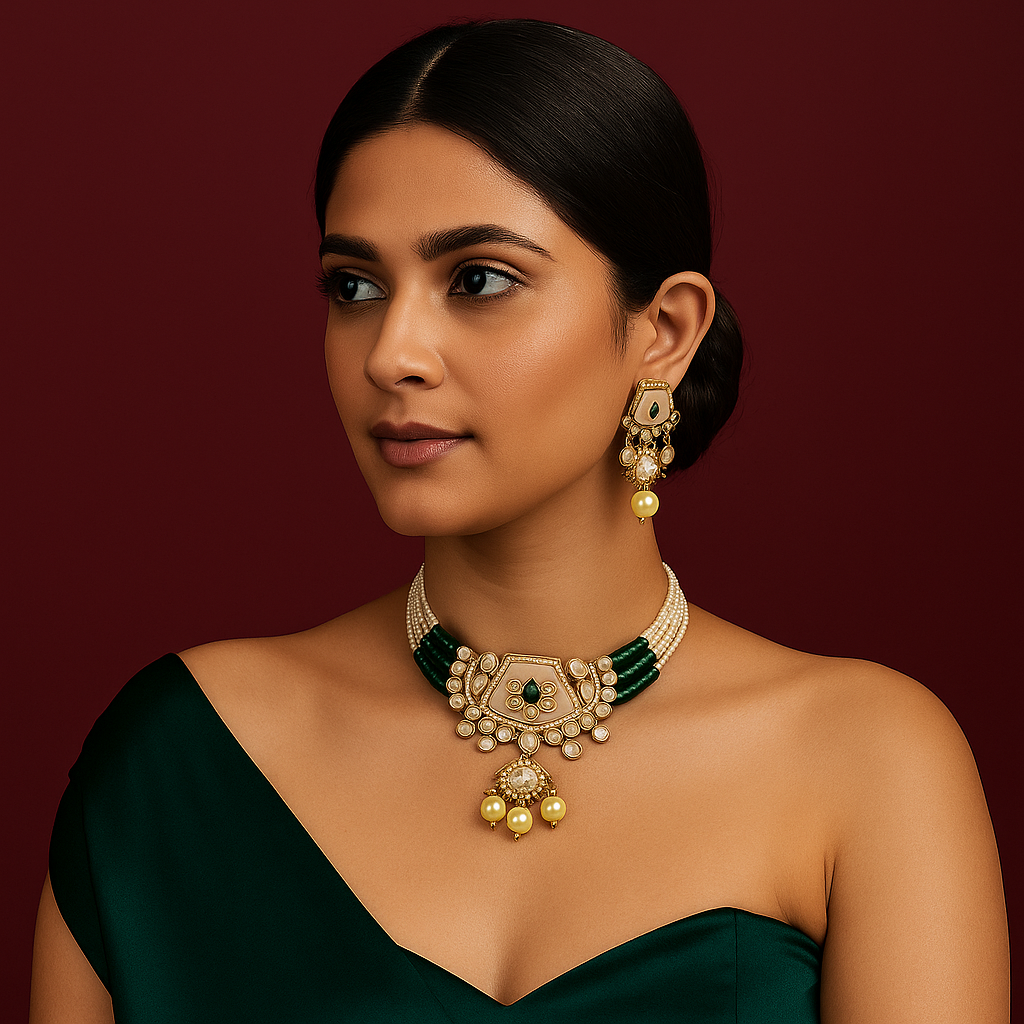 Emerald Green Pearl Kundan Choker Set | Gold-Plated Bridal Jewellery with Earrings | Polki Necklace Set