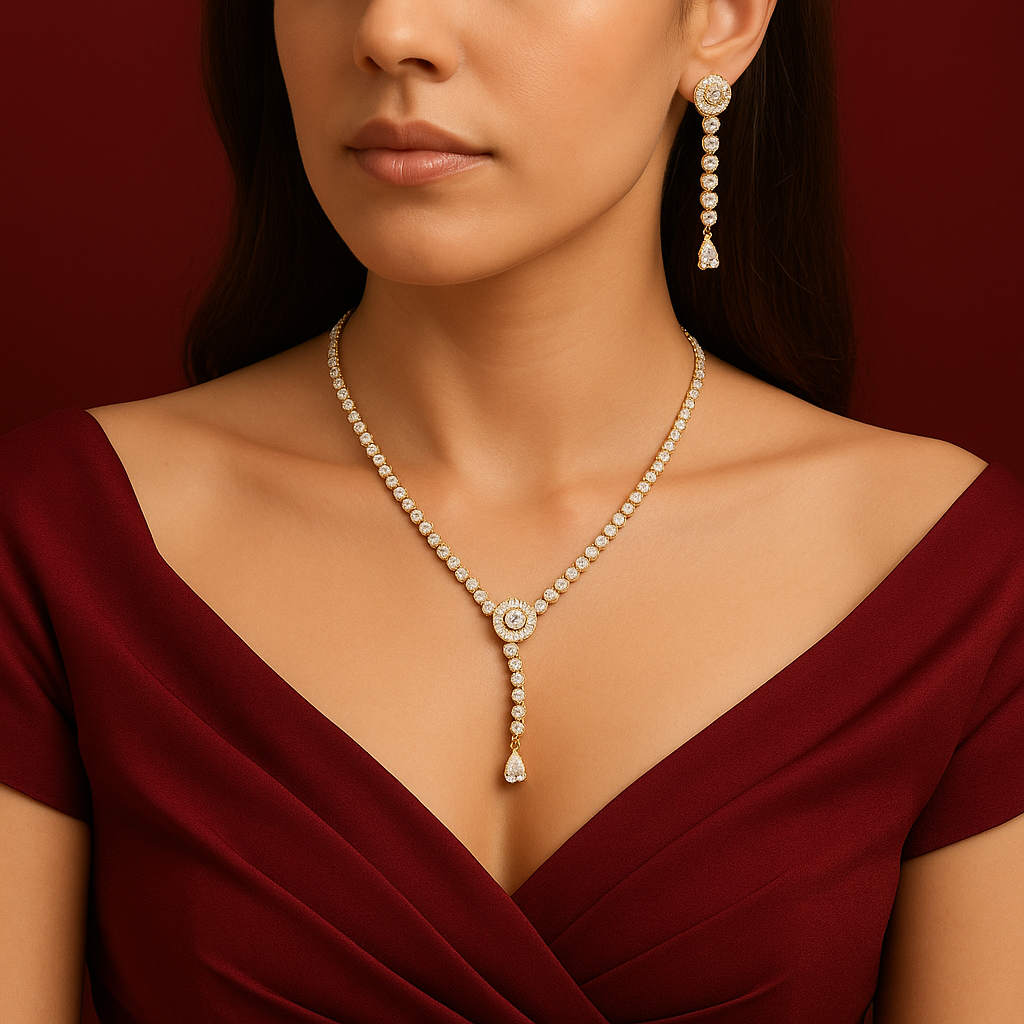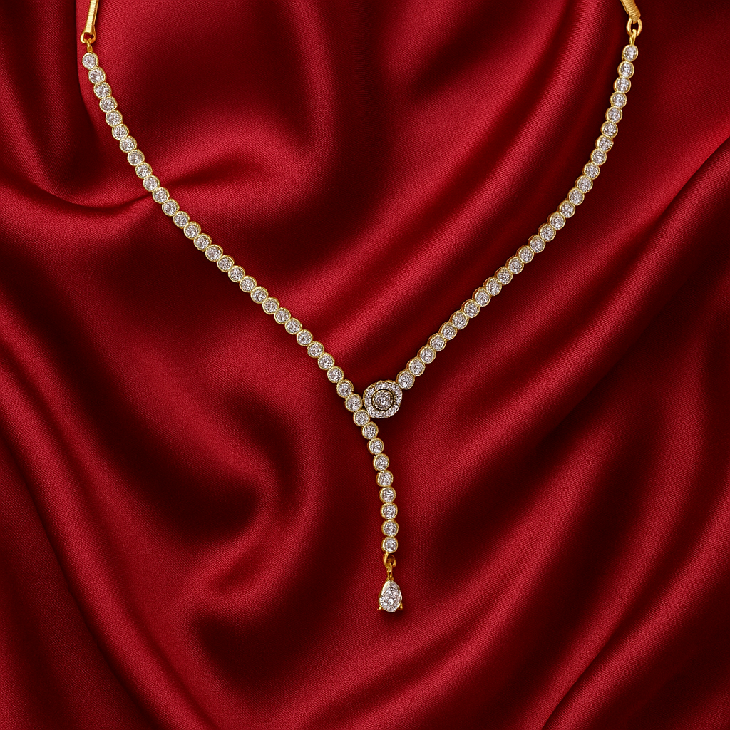 Add a touch of timeless elegance with this Gold-Plated AD Drop Necklace, designed to sparkle with every movement. Featuring dazzling round-cut American Diamonds set in a delicate Y-shaped design, this piece beautifully combines modern charm with traditional finesse. Crafted from premium alloy and finished with gold plating, it offers a luxurious yet lightweight wear — perfect for parties, weddings, receptions, and festive celebrations.