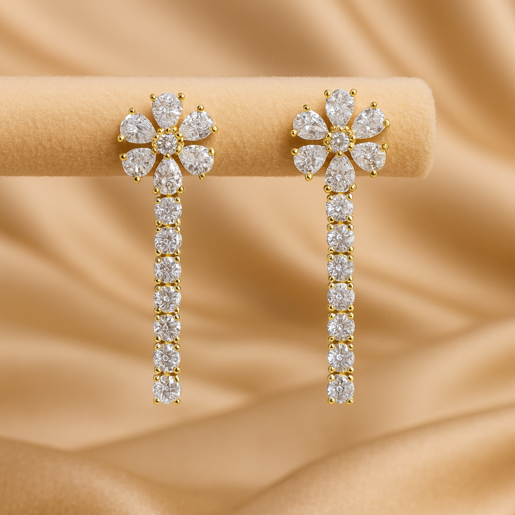 Elevate your style with this Gold-Plated Floral AD Necklace, designed with sparkling round American Diamonds and charming flower motifs on each side. The brilliant stone setting and high-shine gold finish create a luxurious diamond-like look that pairs beautifully with both Indian and Western outfits. Crafted from alloy and finished with long-lasting gold plating, this imitation jewellery piece is perfect for weddings, parties, festive functions, and special celebrations.