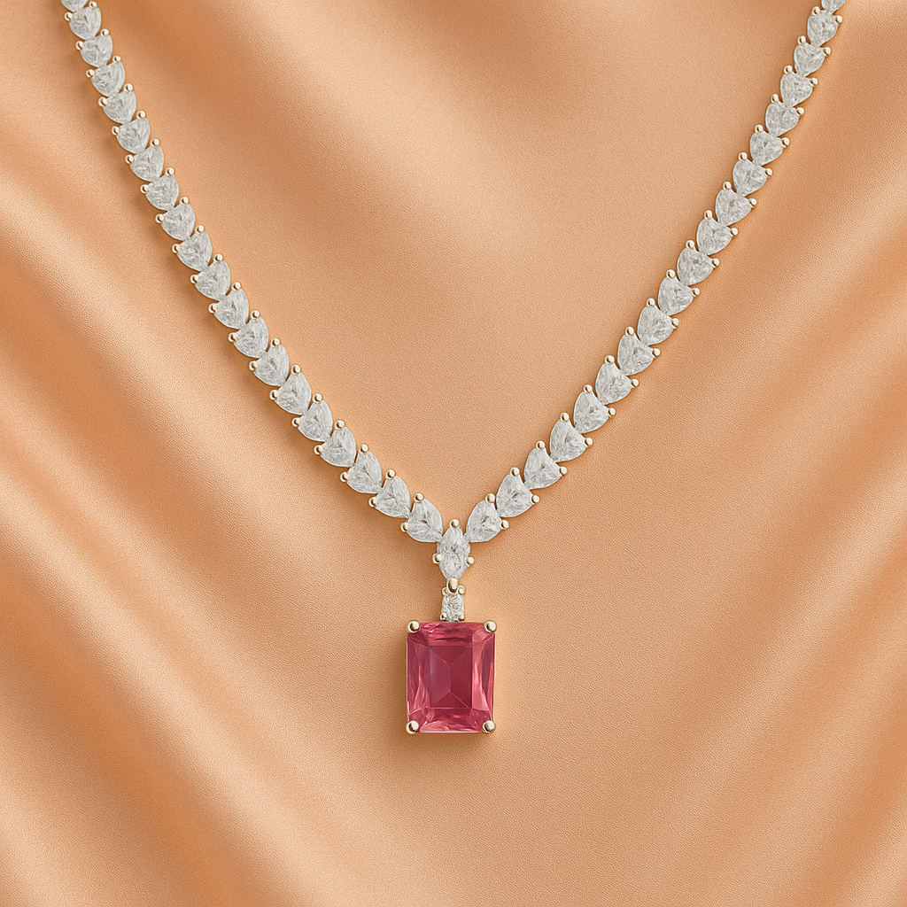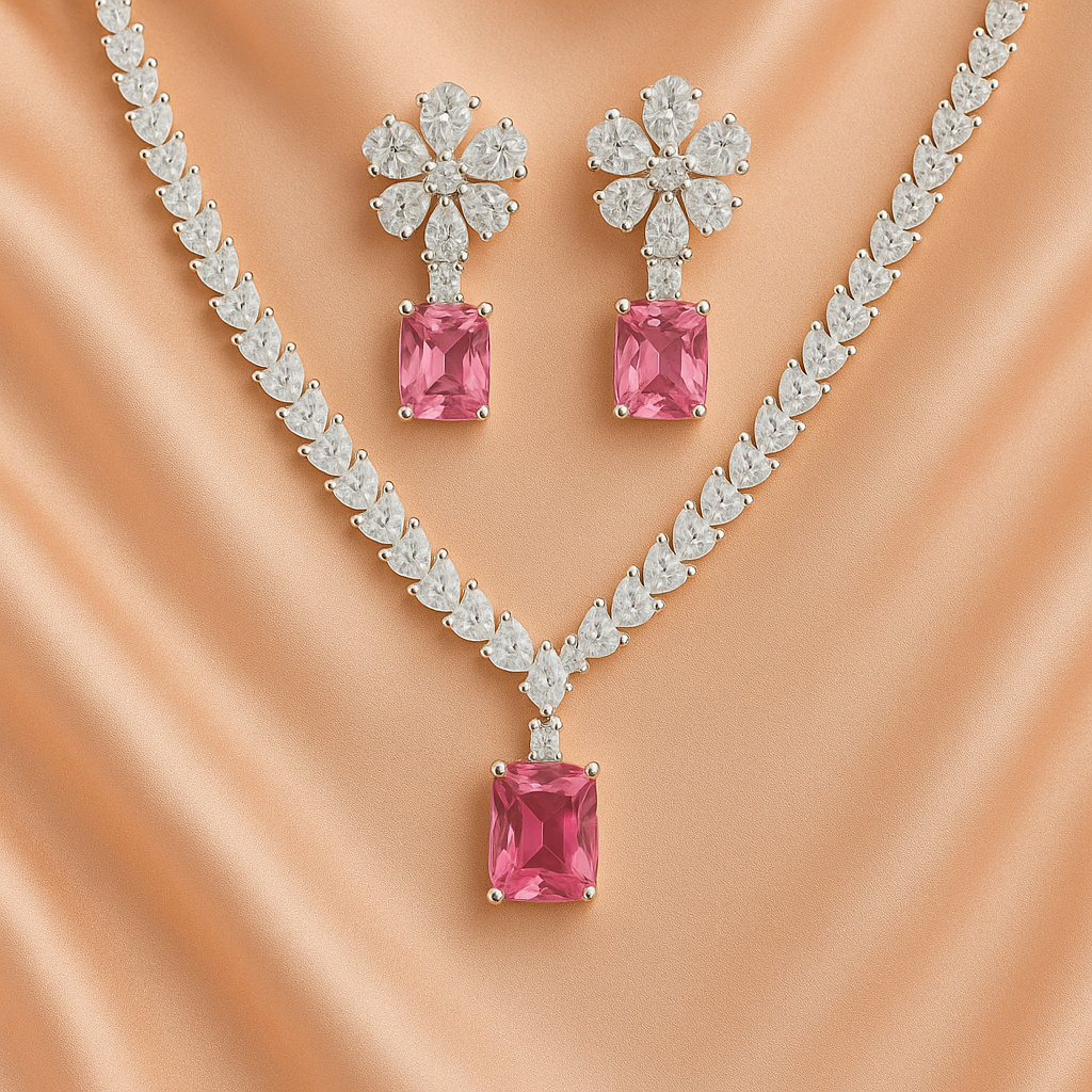 Embrace elegance with this Pink Stone AD Necklace Set, beautifully crafted with brilliant pear-shaped American Diamonds and a radiant pink gemstone pendant. The matching floral drop earrings enhance its charm, making it a perfect blend of sophistication and style. Finished with a rhodium-plated shine, this lightweight imitation jewellery set is ideal for weddings, parties, receptions, and festive occasions. Pair it with sarees, gowns or Indo-Western outfits for a graceful and luxurious look.