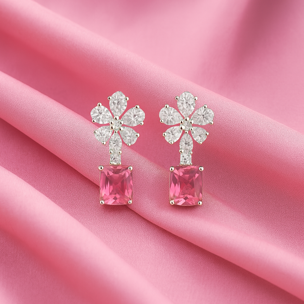 Pink Stone AD Necklace Set | Diamond Look Floral Jewellery | Rhodium-Plated Party & Bridal Imitation Set
