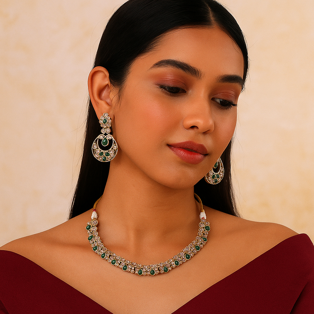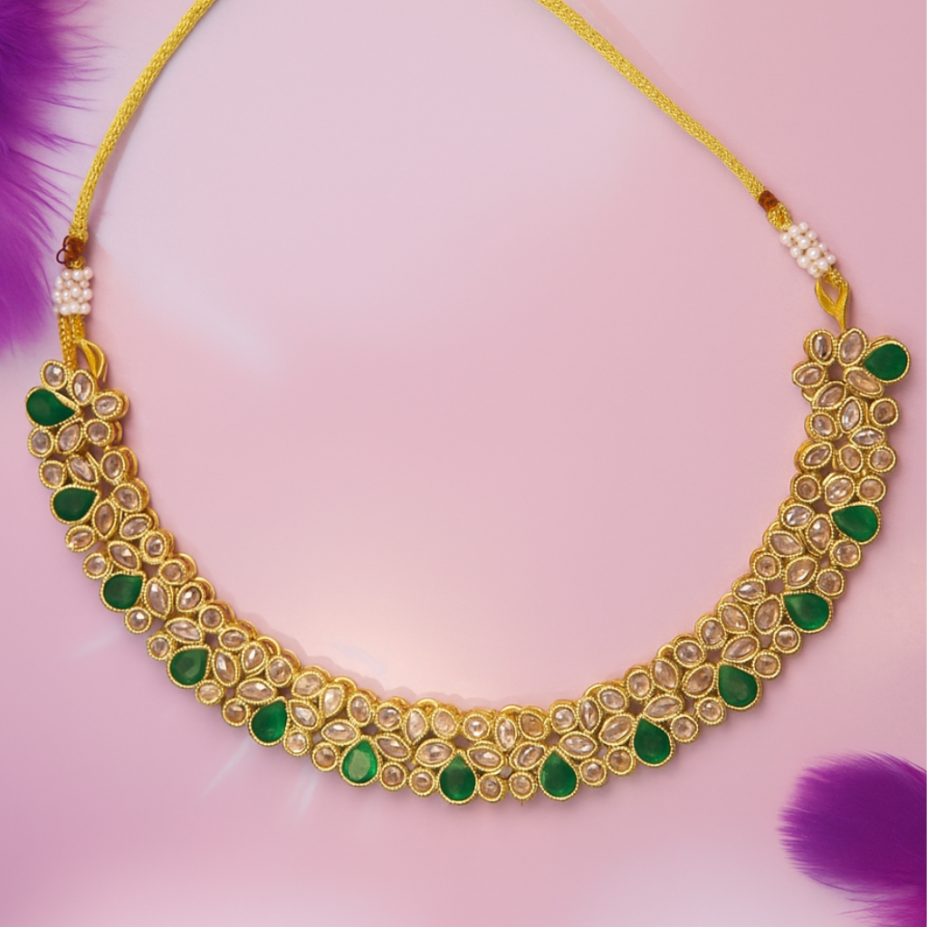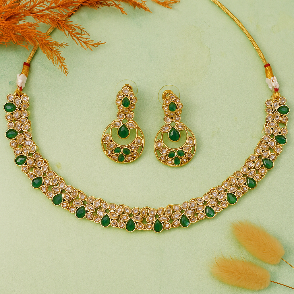 Product Name -Royal Green Emerald Kundan Choker Set with Earrings | Gold-Plated Imitation Jewellery for Women