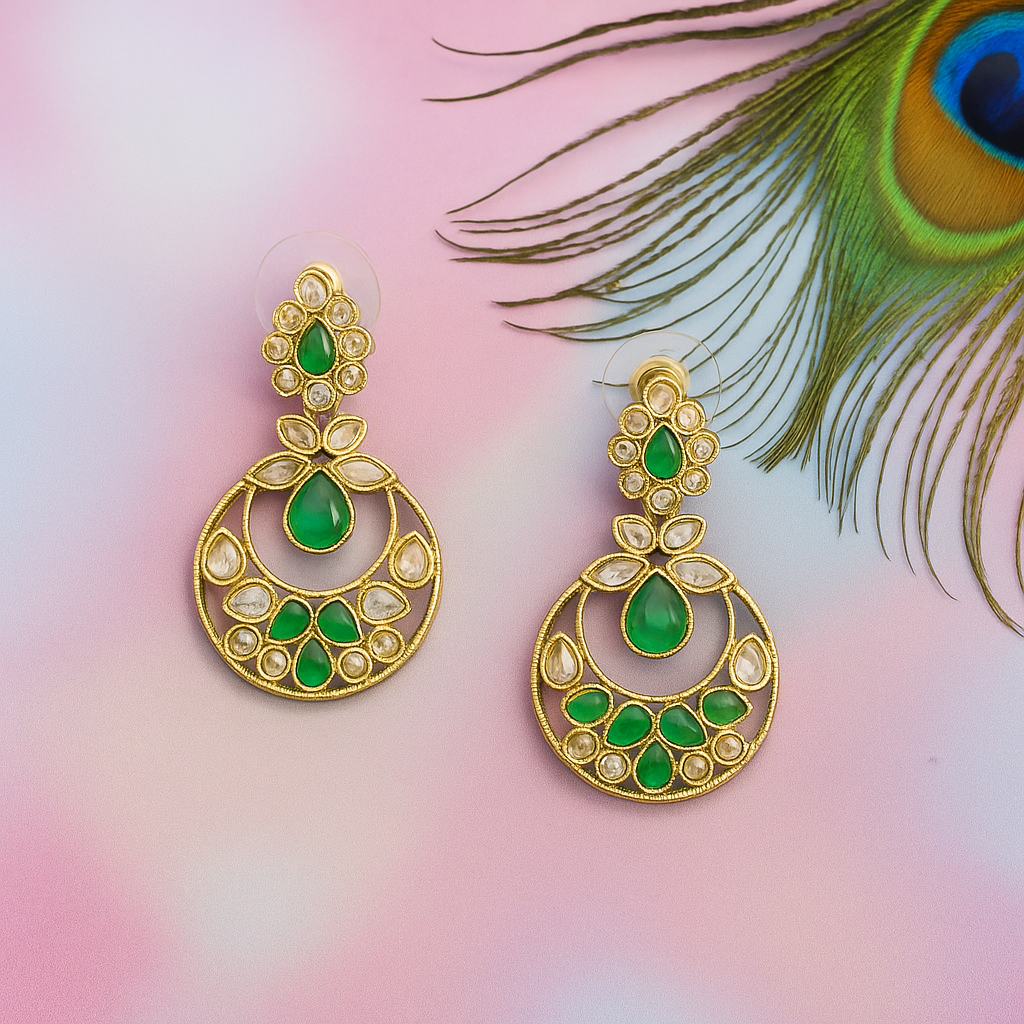 Make a statement of timeless elegance with this Emerald Green Kundan Necklace Set, meticulously handcrafted to perfection. Adorned with brilliant green stones and shimmering white kundan accents, this gold-plated imitation jewellery set radiates royal charm and sophistication. Crafted from premium quality alloy with a 22K gold-plated finish, it pairs beautifully with sarees, lehengas, and festive outfits — making it an ideal choice for weddings, traditional ceremonies, and grand celebrations.