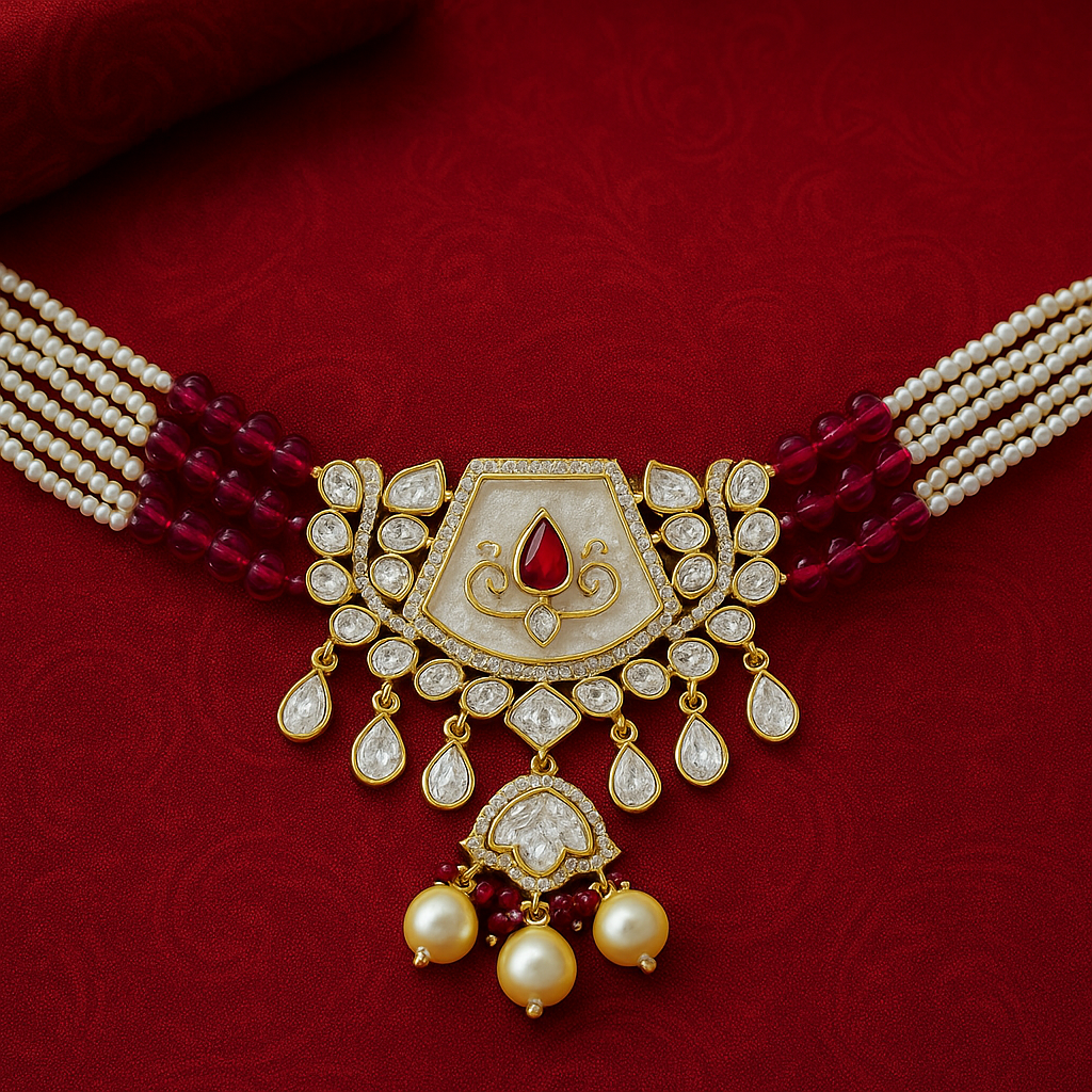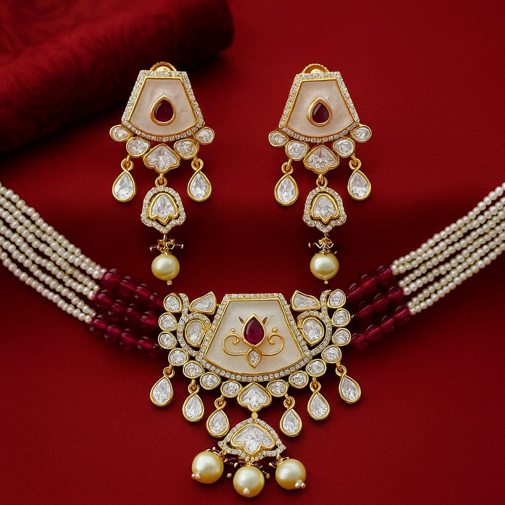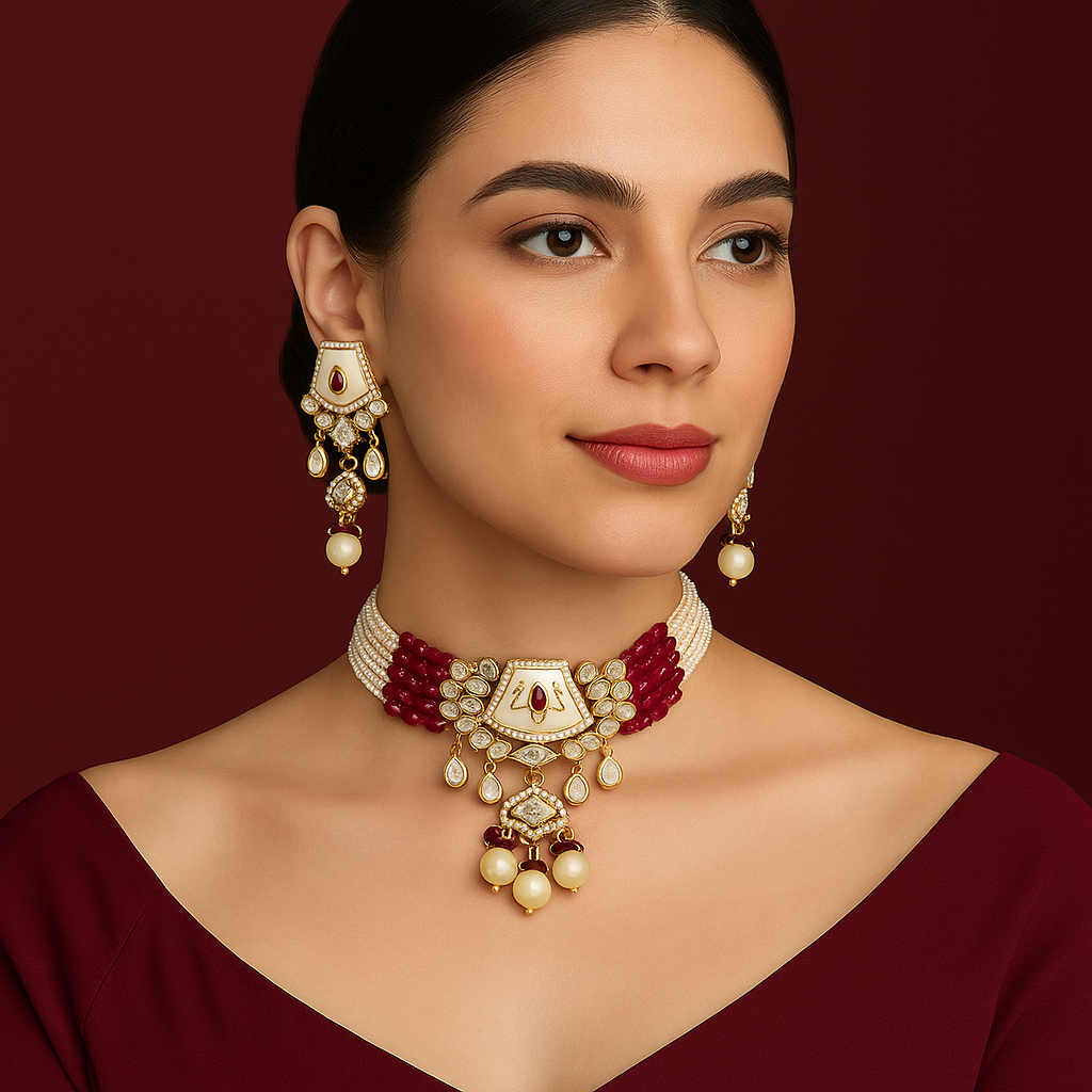Product Name – Royal Pearl & Ruby Kundan Necklace Set | Gold-Plated Bridal Jewellery with Earrings | Polki Choker