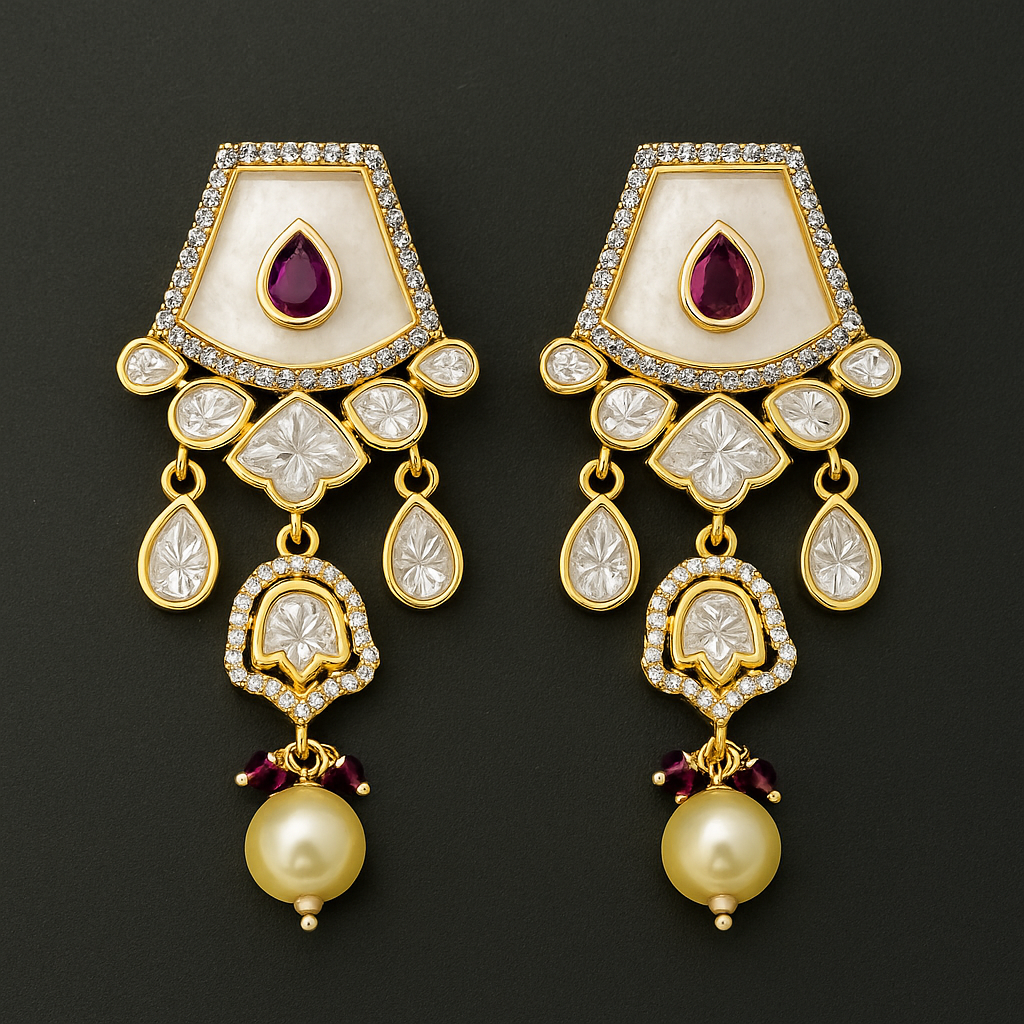 Step into royal elegance with this Royal Pearl & Ruby Kundan Necklace Set, a masterpiece crafted to perfection. Adorned with lustrous pearls, radiant ruby-red stones, and sparkling kundan embellishments, this gold-plated jewellery set beautifully blends regal charm with modern sophistication. The intricate detailing and multi-layered pearl design make it the perfect choice for brides, festive occasions, and grand celebrations.