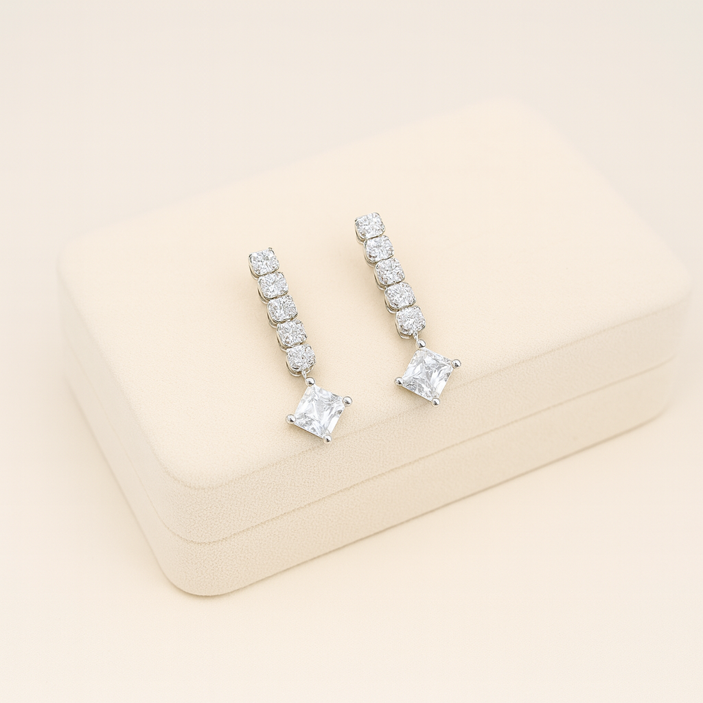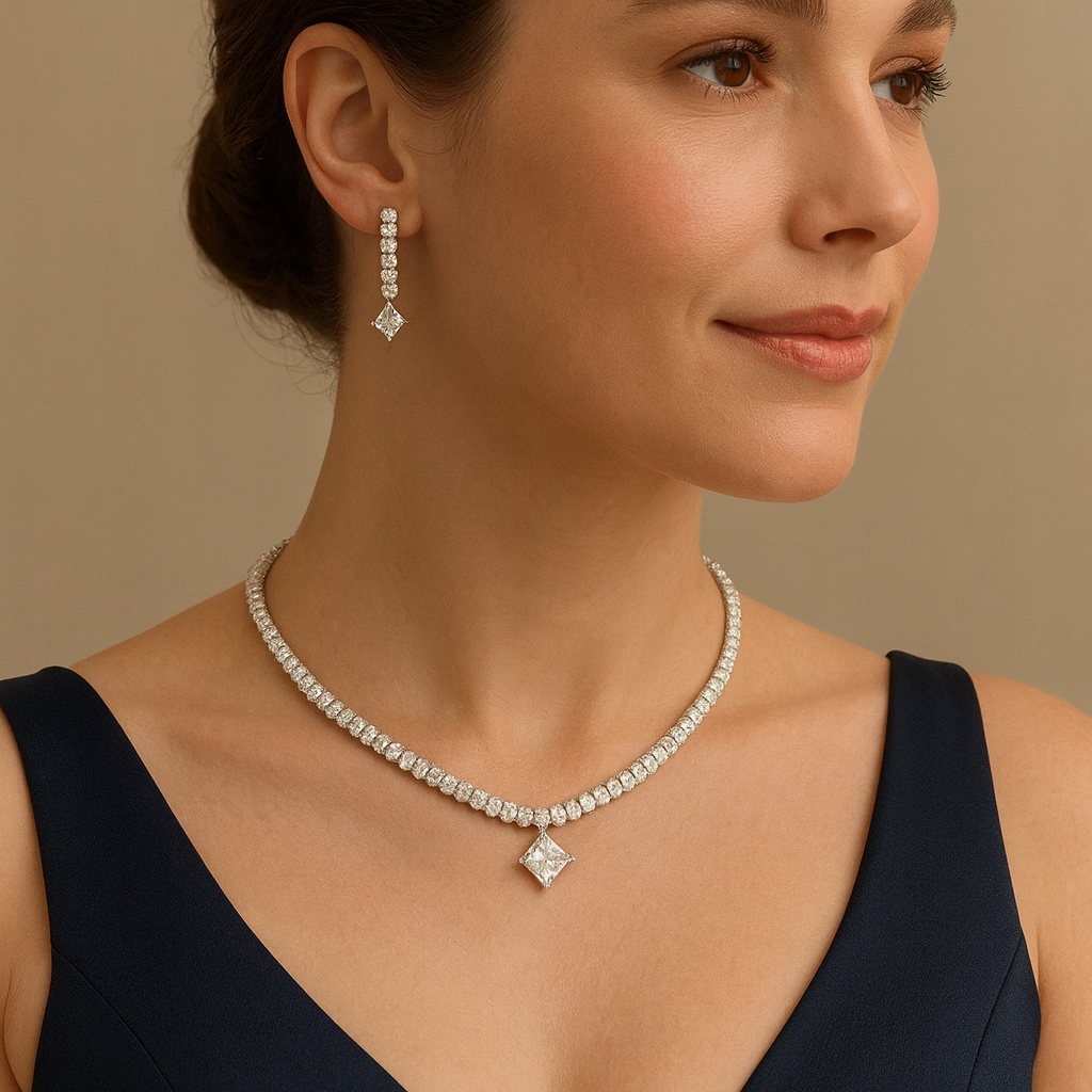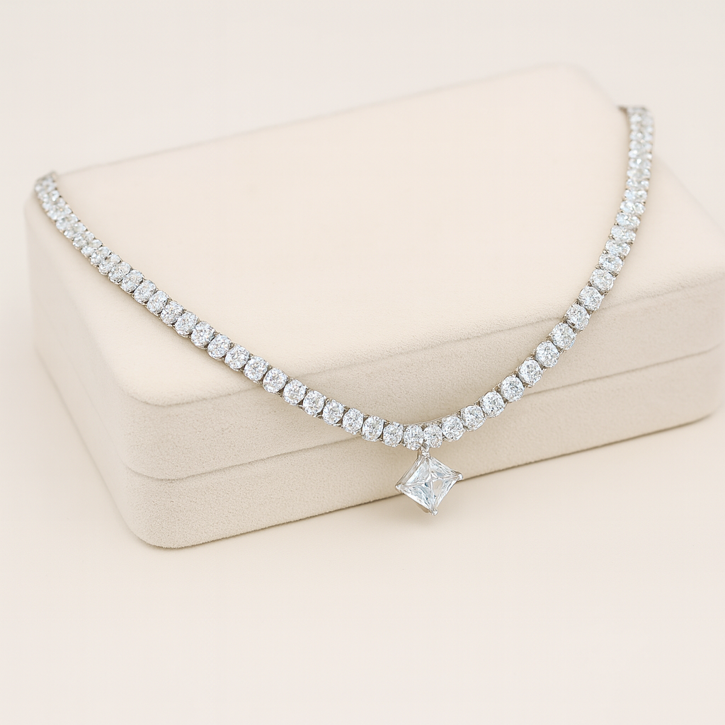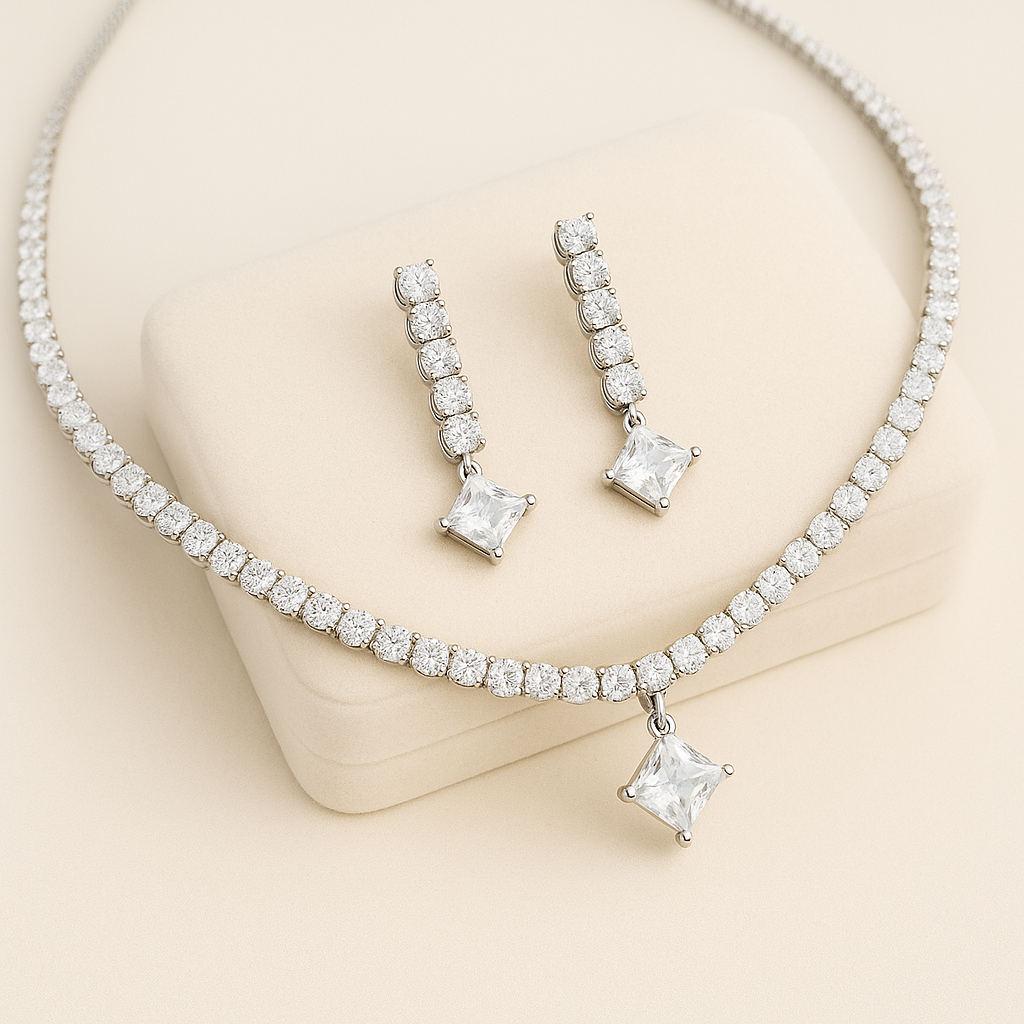 Keep it classy and timeless with this Silver AD Solitaire Necklace, featuring a delicate rhodium-plated chain accented with sparkling round American Diamonds and a stunning square solitaire pendant. Designed for refined simplicity, this lightweight imitation jewellery piece pairs effortlessly with both Western and ethnic outfits. Crafted from alloy with a high-shine silver finish, it’s perfect for daily wear, parties, romantic dinners, and elegant celebrations.