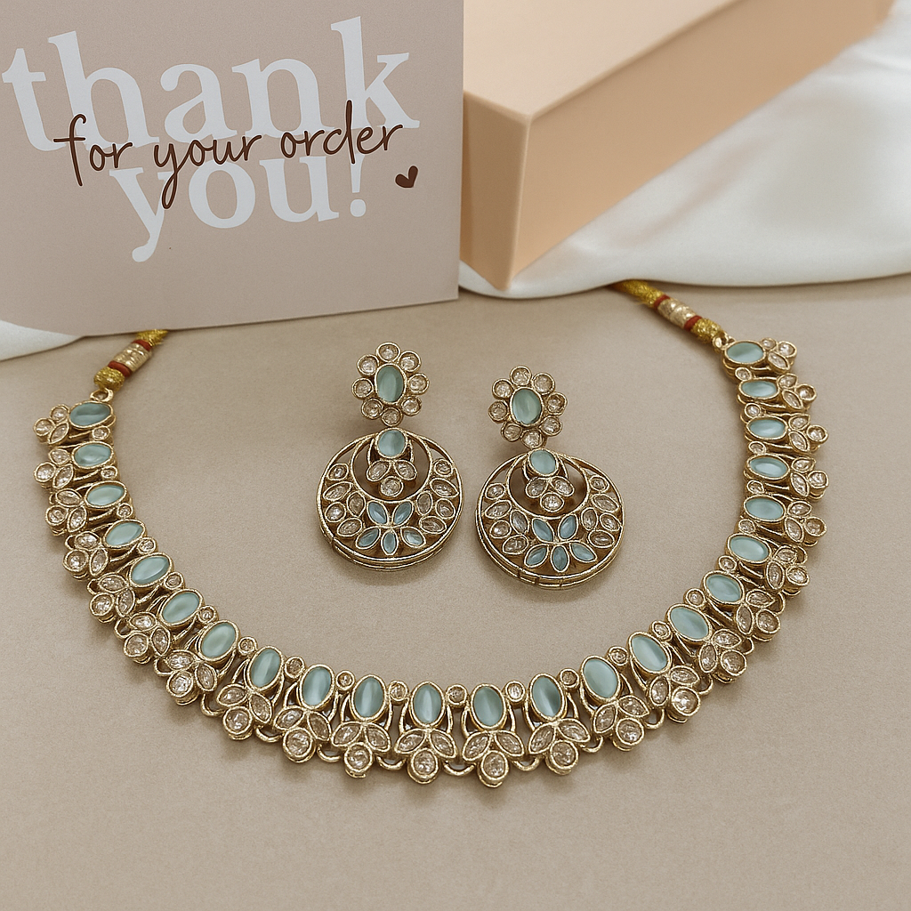 Sky Blue Kundan Necklace Set for Women | Gold-Plated Bridal Jewellery with Earrings | Imitation Choker Set